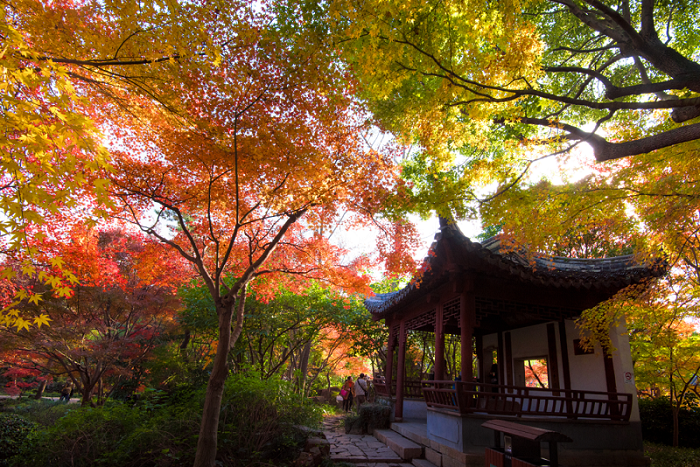 秋,是人们对秋霞圃的第一印象,其秋色之美的确颇负盛名,园内植有鸡爪槭、羽毛槭、红枫三种槭属植物,约151棵,总面积达2500平米。其中,清镜塘景区北侧栽植的枫树在每年秋季12月前后,叶色变红,高低错落的大片红叶,给人一种层林浸染、漫山红遍的美感,投影于清镜之中,“落霞秋水”自成一绝,每年秋天都吸引大量游客慕名前来。最佳观赏期为11月下旬至12月中旬。