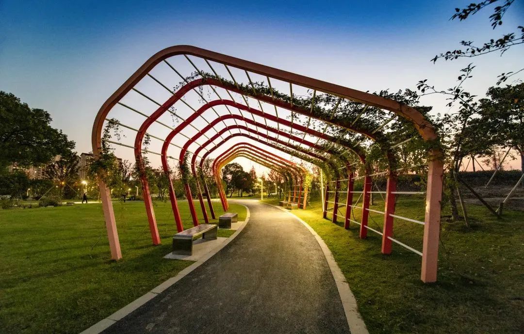闵行科创公园沿河而建,水资源丰富,沿河打造了水上栈道,方便游客与河道美景亲密接触,同时利用园内水系打造山水景观,形成丰富多变的景观空间。尤其每当夕阳西下,余晖映满河面,美不胜收。