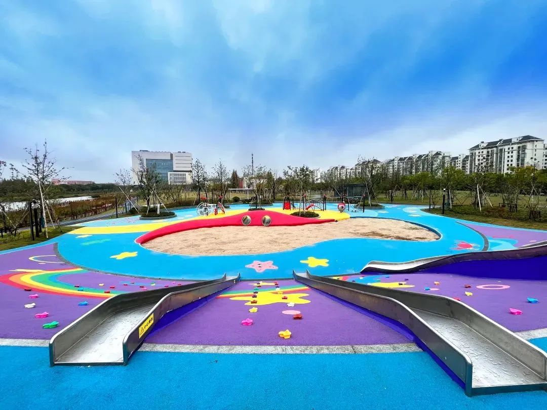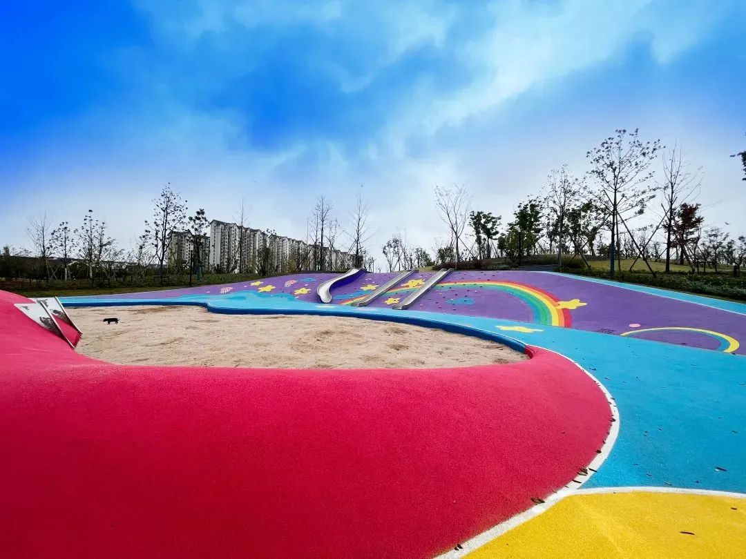 这里有专门打造的儿童乐园区域,主要分为滑滑梯区、挖沙区及攀爬区,可以满足不同年龄段孩子的游玩需求。乐园区域脚下有专门为儿童铺设的防摔回弹地面,地面上还印有螃蟹、海豚等动物,画上了跳房子游戏所用的“房子”,童趣十足、惹人喜爱。