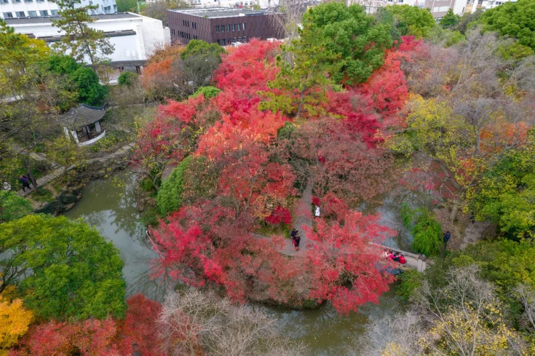 古猗园始建于明代嘉靖年间,原名猗园,取自《诗经》中“绿竹猗猗”一句,但古猗园美的不仅绿竹,秋日时节更是美不胜收。在未来的几周内,园内将有一波秋色缓缓上线,主要分为红、橙、黄三大色系,错落有致,为游人献上一场视觉盛宴。