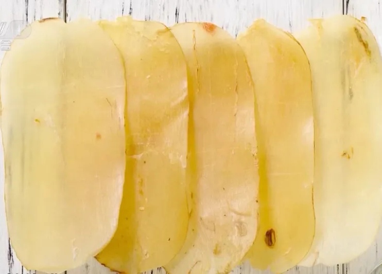 天麻饮片的外表皮是淡黄色的,切面这里是黄白色或者是淡黄色的,呈角质样的比较饱满。