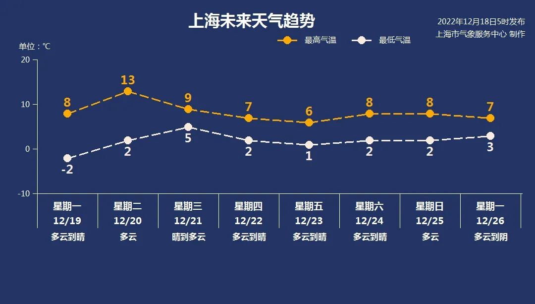 本周申城天空状况较好,基本以晴或多云天气为主,气温有起伏,周二气温将升至近期最高点,最高预计可达13℃。