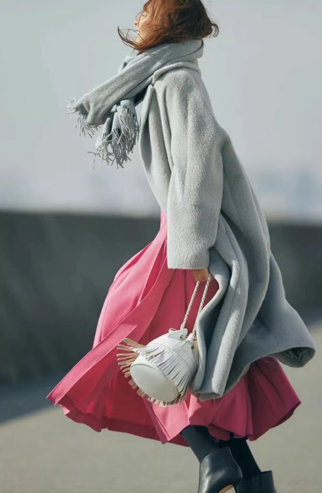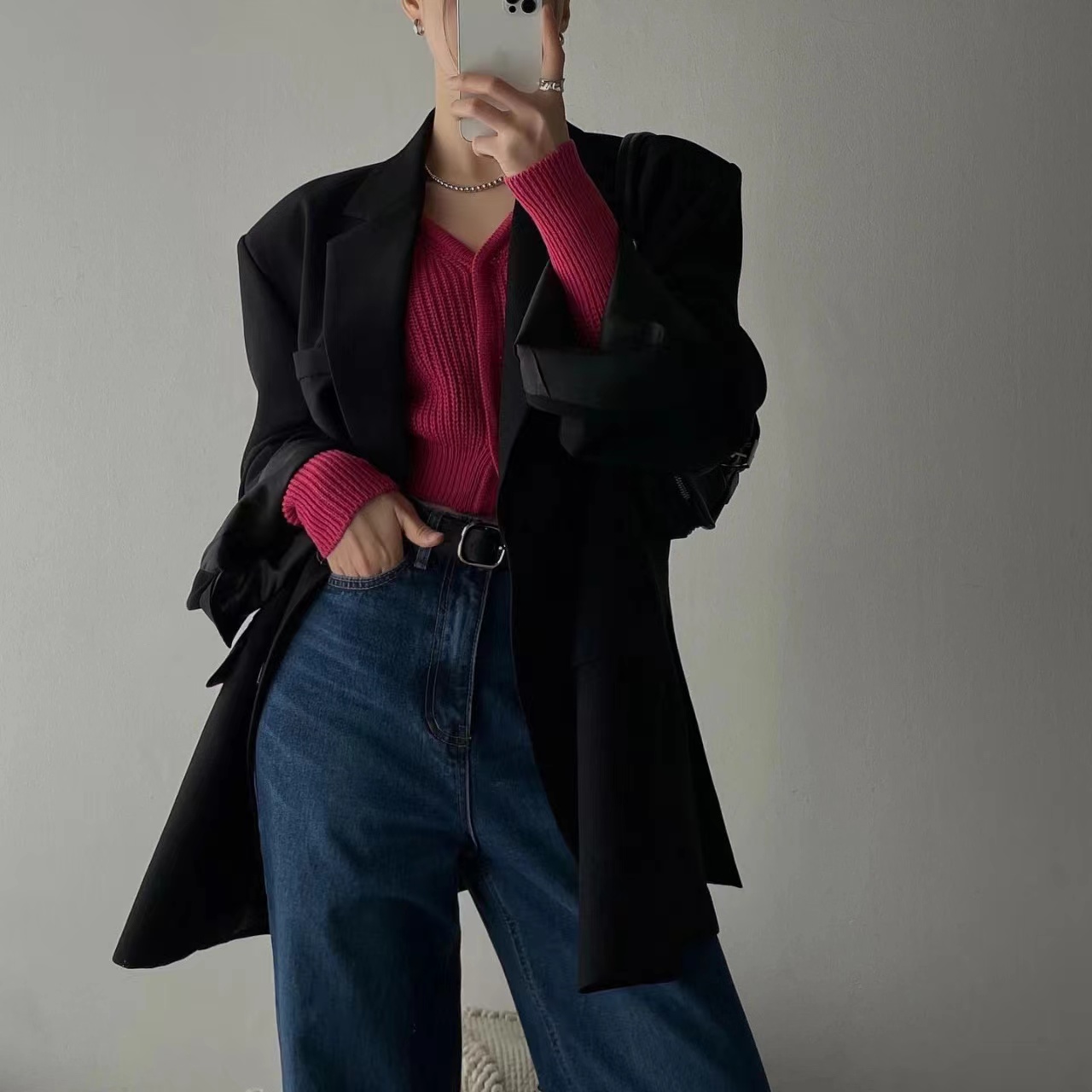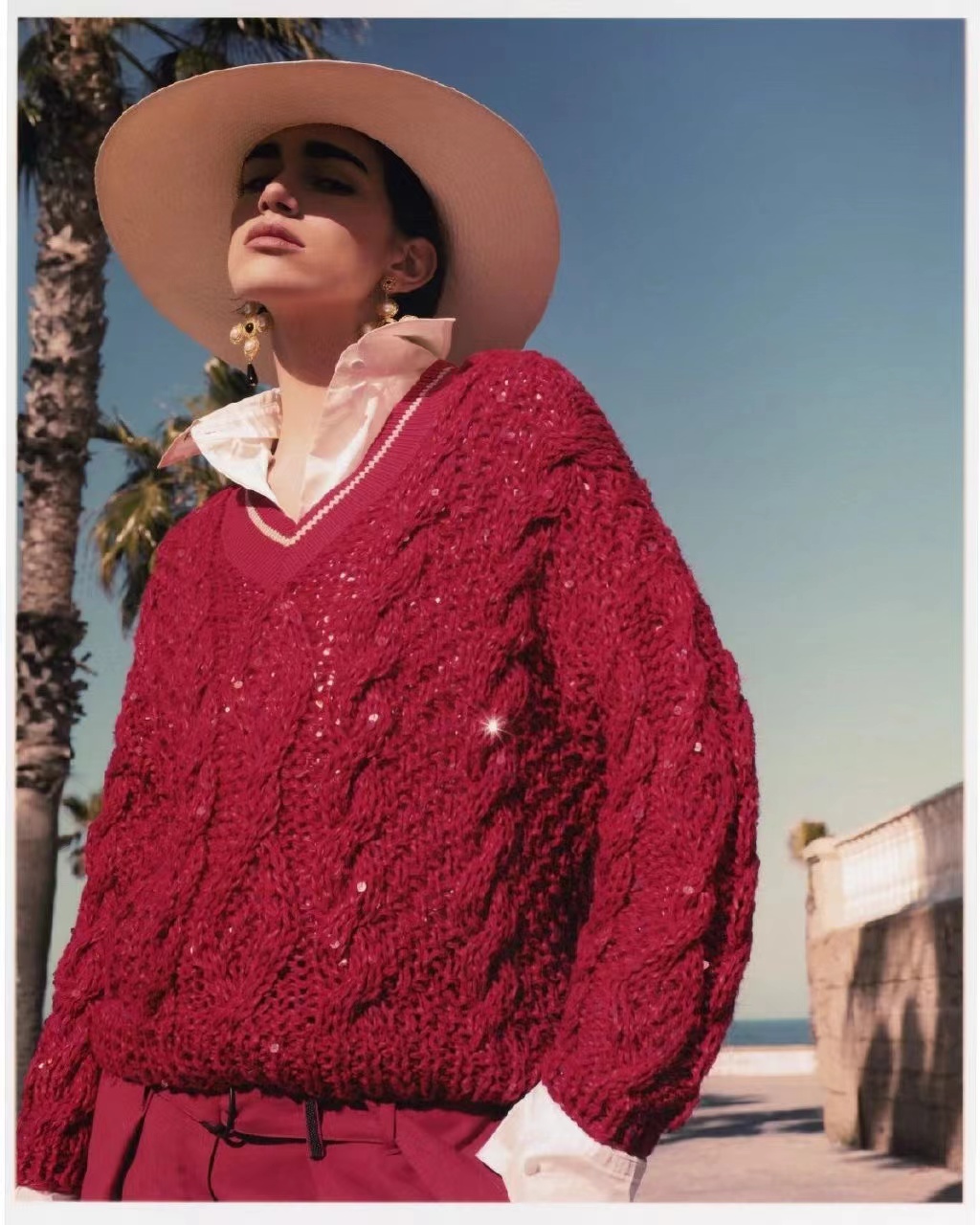 深冬季节,洋红色毛衣就可以尝试一番,为冬日加入活力色彩,足够温暖治愈。作为内搭时,占整体穿搭面积不多,却足以起到点亮视觉的效果。