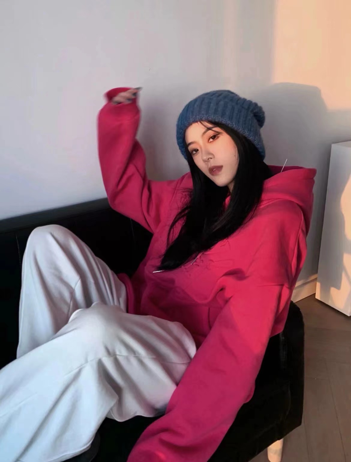 卫衣也是可单穿可内搭的绝佳单品,本就慵懒舒适的它,配合洋红色就多了几分灵动。