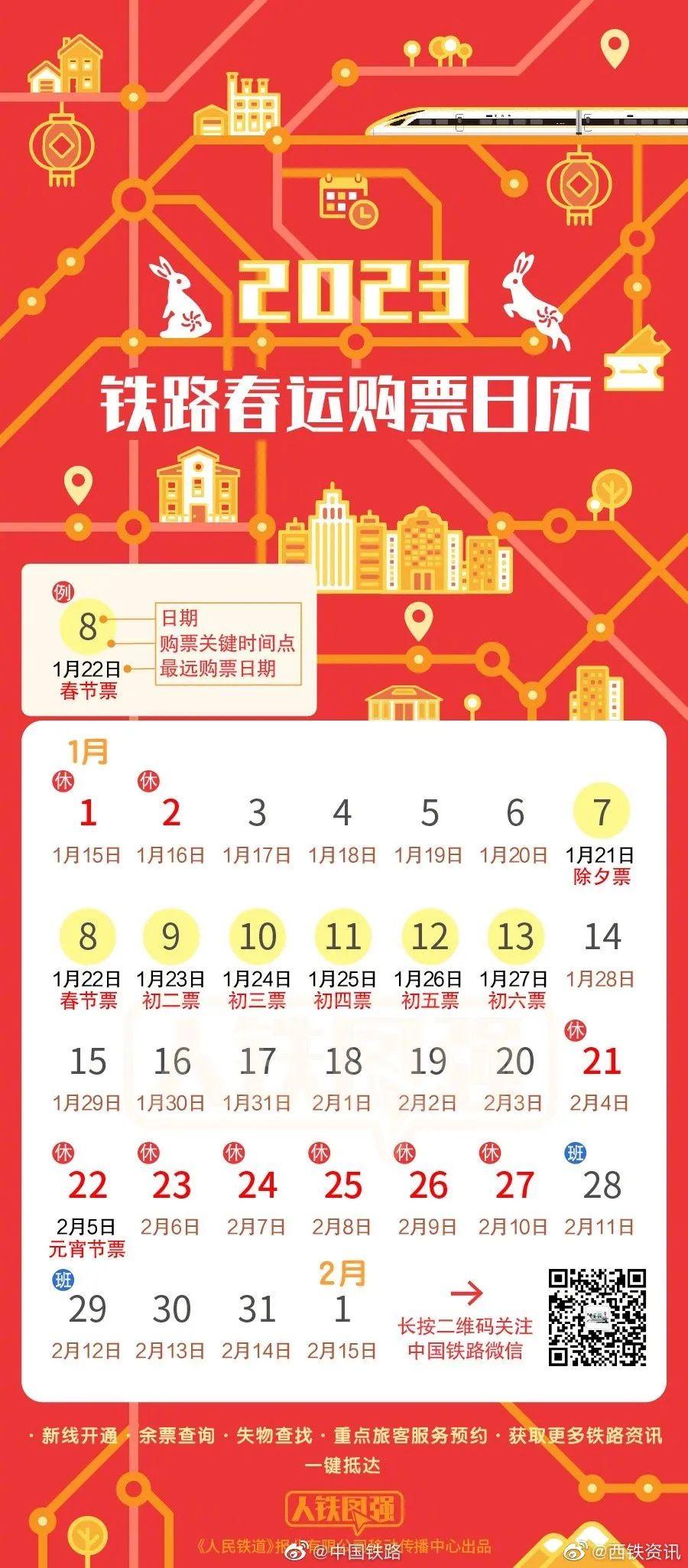1月5日起至1月7日,2023年春运高峰期火车票迎来售票高峰,1月7日当天可购买除夕当日火车票,1月5日起可购买春节前三天车票。