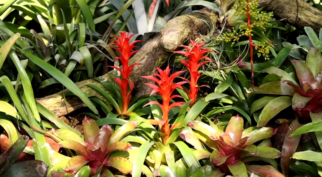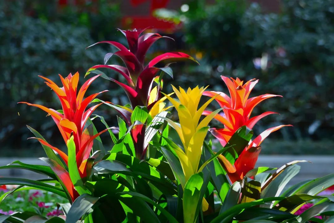 虽说名为“凤梨”,星花凤梨可不是大家心目中的菠萝。辰山植物园高级工程师寿海洋说,全世界凤梨科植物有数千种,我们平常吃的菠萝确实是其中之一,但除了菠萝声名远播之外,凤梨科植物中还有众多的观赏品种,称为观赏凤梨。它们的叶多呈丛生莲座状,或有美丽的斑纹、斑点、镶边。圆锥花序或穗状花序由叶丛中抽生,艳丽而庄重,观赏期可达数月。