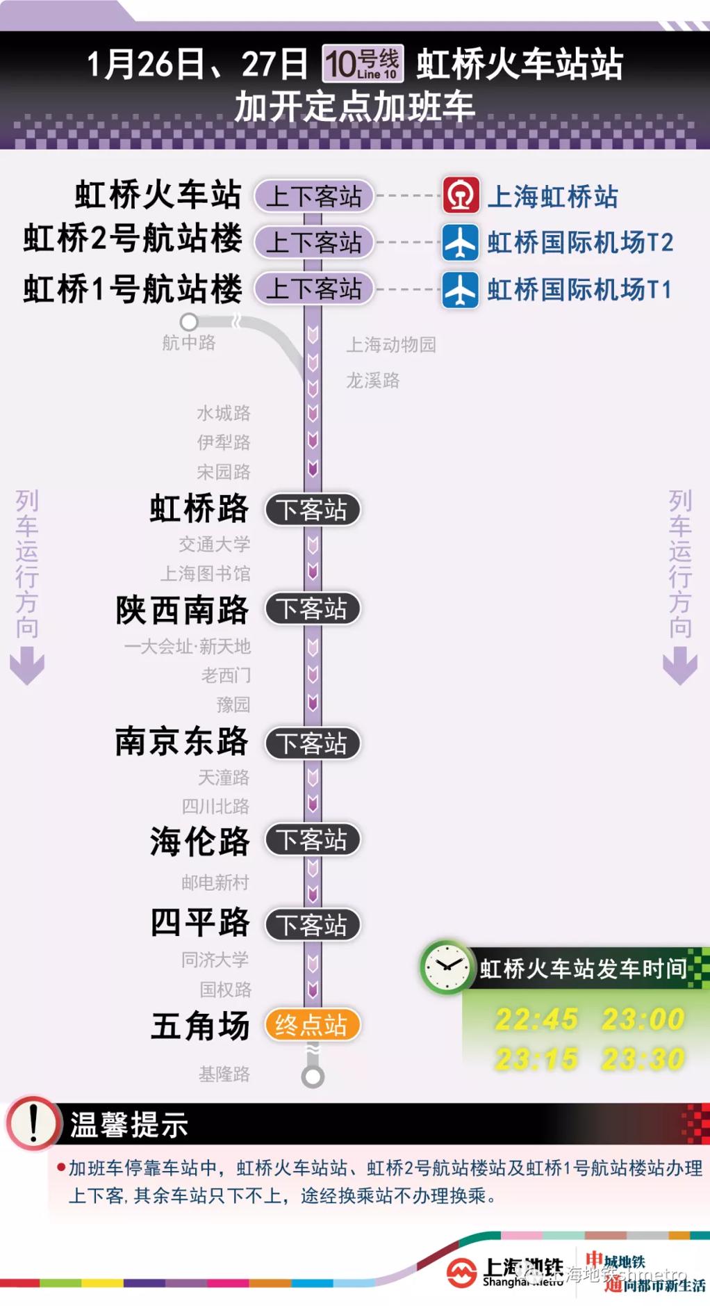 1月26日、27日,地铁1、10号线末班车发车时间延长至23:30。详↓