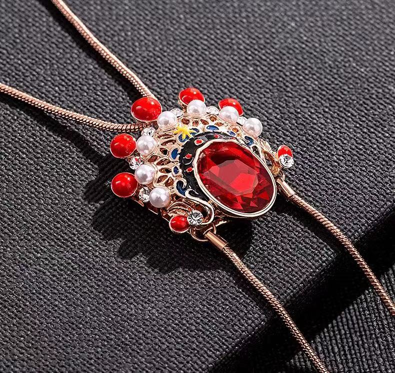 除了耳环以外,与这个季节相配的饰品怎么能不提毛衣链。纯色的毛衣搭配红色的挂坠,二者之间相辅相成,营造了氛围感之余,也能够让装扮的亮点更加突出。吊坠的设计运用了传统文化中的刀马旦元素,传递国潮新风尚。