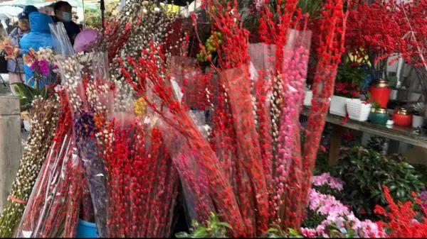 银柳是上海传统年宵花品种,又称棉花柳。银柳上毛茸茸的其实是花芽,原本为银白色,通常会被染色。不论是单色还是多色搭配,都很适合节日氛围。加上银柳单价不高,却谐音“银留”“银楼”,所以很受市场欢迎。