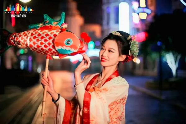 每天的特定时间,现场还有手持鱼灯的巡游队伍和绮罗长袖的唐装不倒翁小姐姐,让人仿佛穿梭去了千年前的市井街头。