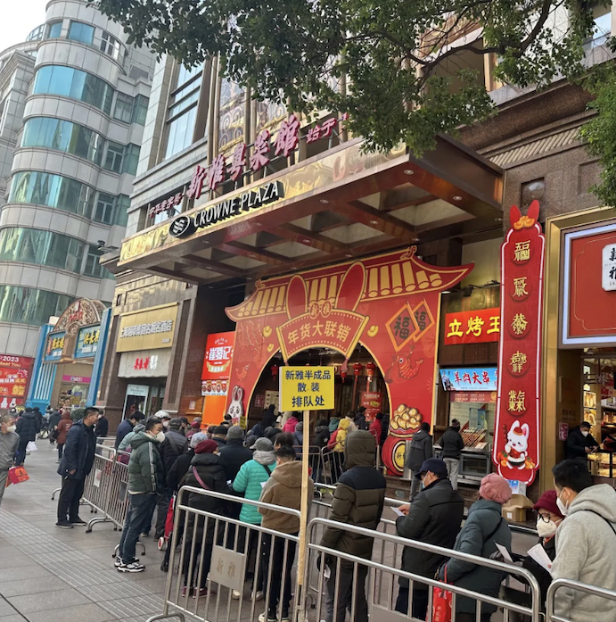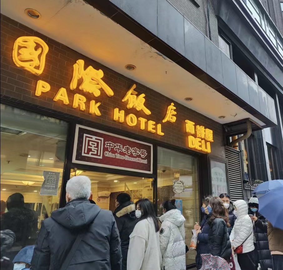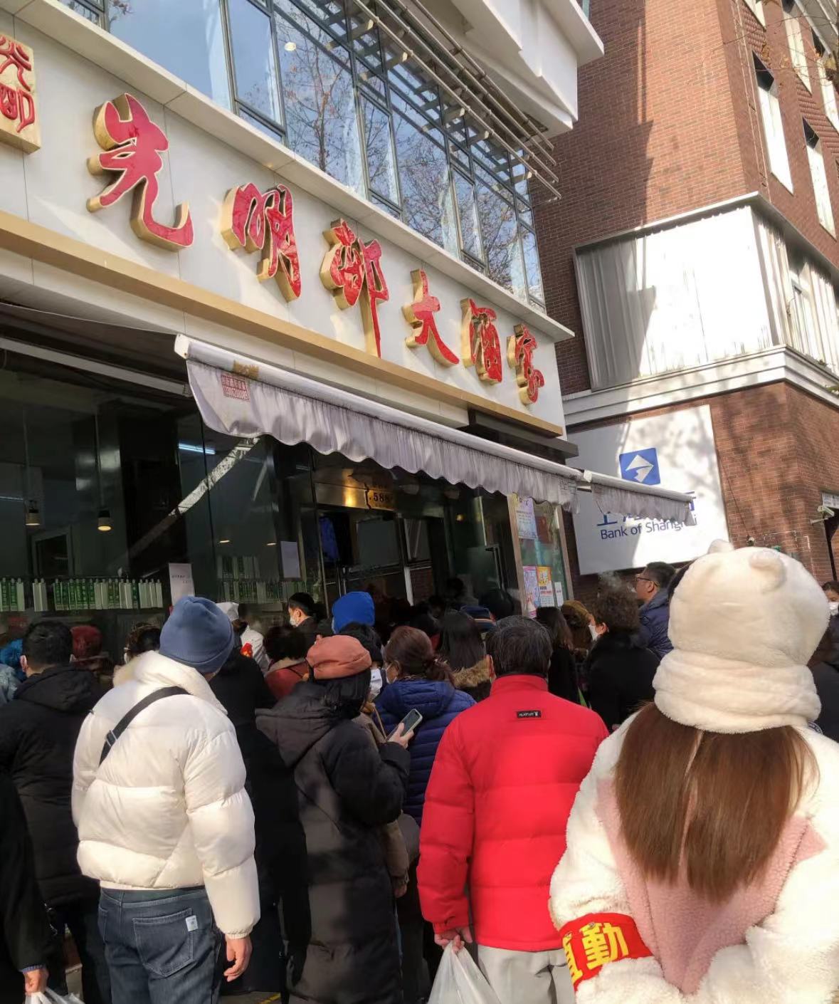 除了美新点心店,沪上还有许多老字号也迎来了客流高峰。春节里的第一食品商店人头攒动,食客们为采购年货忙得不亦乐乎;国际饭店门口的排队距离一度超过百米,叱咤上海滩几十年的蝴蝶酥在食客们心中不容错过,是难以忘怀的“白月光”;光明邨大酒店门口分别购买鲜肉月饼、点心、盒装熟食、称分量熟食的食客排出了整整四条队伍;南京路新雅粤菜馆门前提取半成品菜的食客堪称人山人海……这排着排着,老字号门前的队伍与店内热热闹闹的景象成为了上海春节的一道风景线,申城的年味在年前就已经早早地到来了。