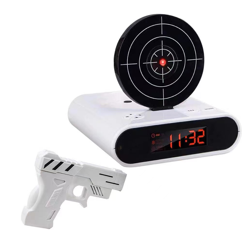 举起手枪,瞄准靶心,聚精会神地射击……这并不是影视剧中的桥段,而是一款“起床神器”打靶闹钟。影视剧或是综艺里偶尔响起的闹铃声,常常让网友大呼“心脏骤停”。除了大家熟知的手机闹铃以外,市面上开始出现了各式各样的闹钟可供选择。这款打靶闹钟就是其中之一。如同游戏一般,它拥有普通、困难两档模式可选,在设定的时间分别需要打中1枪或者5枪才能够停止闹钟。光是打中但是不起床也没用,每隔五分钟就会再次闹响,爬起来长按闹钟上的“M”键3秒才能彻底停止。