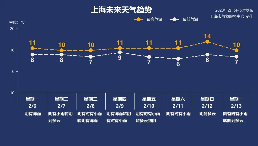 2月上旬,受暖湿气流影响,我国南方和中东部地区都开启阴雨模式,上海也不例外,本周冷空气不强、雨水常探访,气温基本在6-14℃之间,体感较为阴冷,防雨、防寒都要注意。大家外出记得备好雨具,想要晾晒衣物也只能等等等了……
