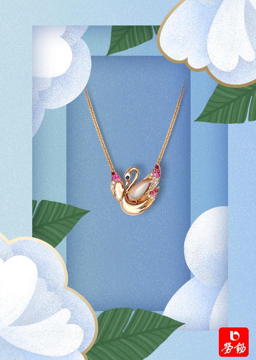 老凤祥设计师打造的“天鹅之舞”胸挂是两用翡翠饰品,天鹅曲颈低头,尽显曼妙之姿,伸展双翼,引翅拍水,娴雅胜似仙子。作品以莹润的冰翡,璀璨钻石、红蓝宝石和玫瑰金相融合,将美丽与优雅勾勒的淋漓尽致,栩栩如生的姿态有如语言般,完美传递出对爱的忠贞和守护。