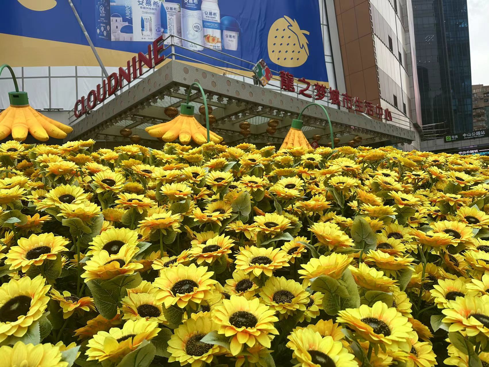 龙之梦城市生活中心门前的向日葵“花田”是朝气的代名词。在“花田”前拍拍照片,或是索性坐在巨大的向日葵花伞下小憩,别有一番惬意。