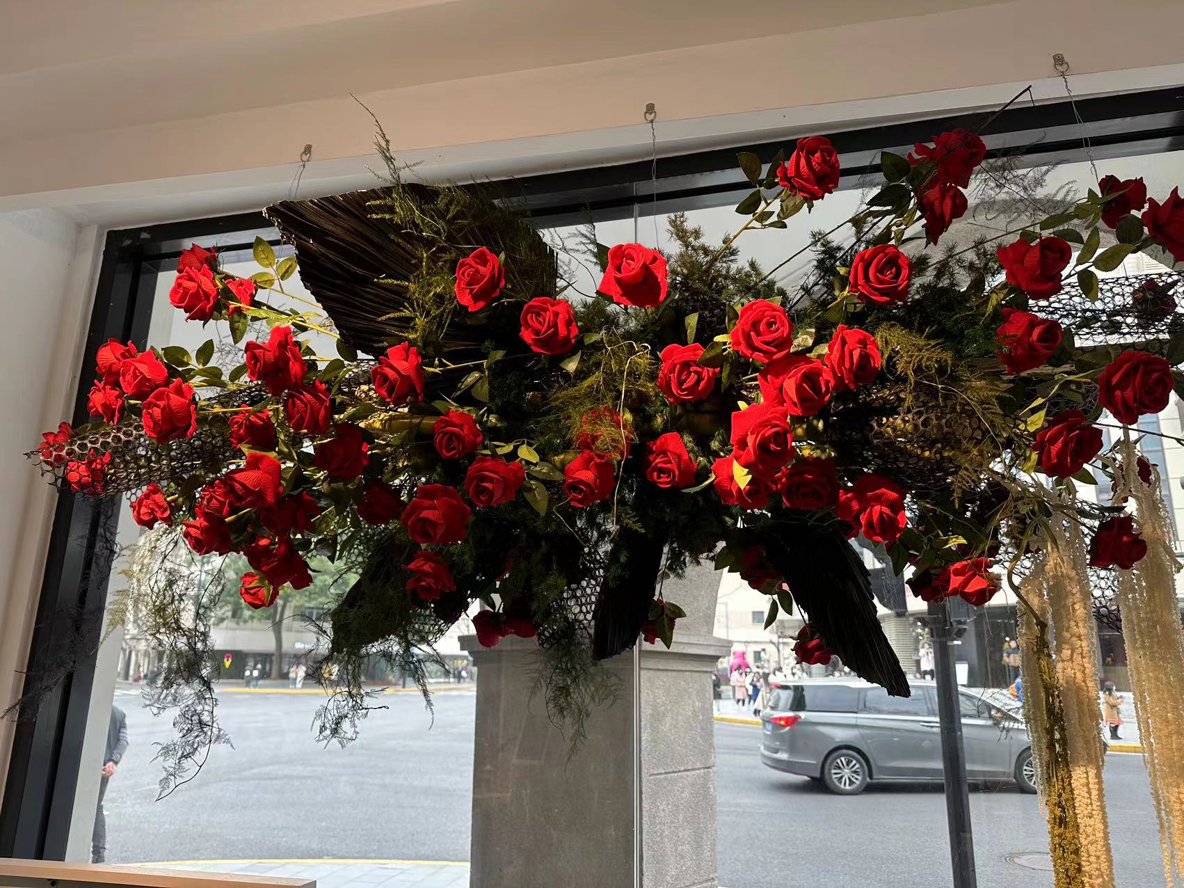 位于衡复历史风貌区的武康大楼作为上海众多网红打卡点中的“常红”选手,集浪漫、浓厚的人文气息于一身。这家将玫瑰瀑布搬到街头的店就开在武康大楼下,堪称坐拥“C位”。“玫瑰装置将会持续到活动结束,为街头增添浪漫,也表达了我们对艺术的理解。”工作人员表示。目前这里正在开展由“新华文创”带来的《冬日春歌》主题展览,他们在武康大楼最前端的30°空间打造了一个数字城市花园,这个展览将会持续至3月9日。携手东一美术馆,新华文创邀请了CG艺术家对文艺复兴早期著名艺术家波提切利的作品《春》中的花卉进行建模、渲染,生成独特的数字艺术品。
