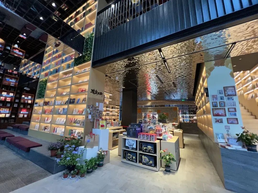 中版书房·奉贤店位于青村老街,基于此,中版书房1层和2层引入了两个不同的设计概念——“水乡书镇”与“时光隧道”。一楼吊顶的水波纹不锈钢,灯光打上去,仿佛身处水面之下,营造出江南小镇的氛围,在中版大气简约、文化底蕴的基础上添加了青村水乡的元素。