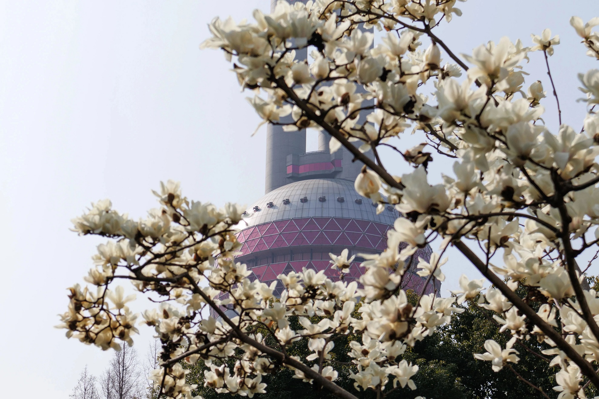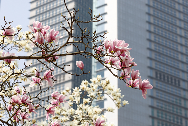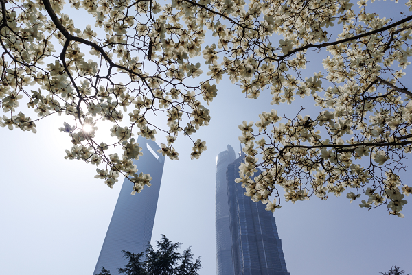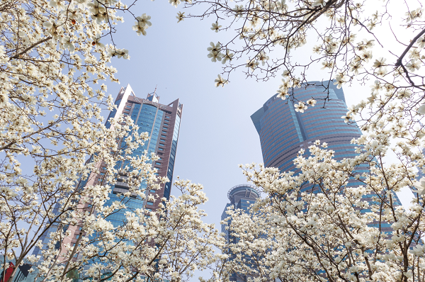 玉兰同框“四件套”,四栋地标性建筑在市花的映衬下交相辉映,凸显春日上海的蓬勃生机。