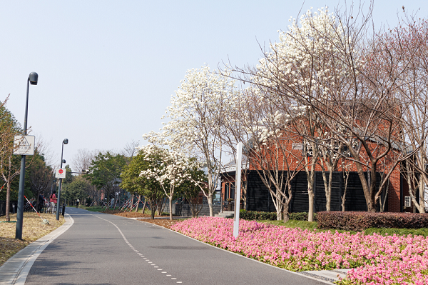 从步道往东看洁白的花朵映衬了东方明珠与浦东美术馆,往西看玉兰花又与浦西的白玉兰广场相映成趣。