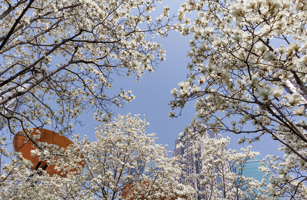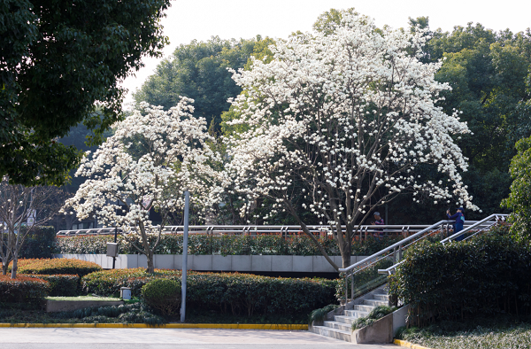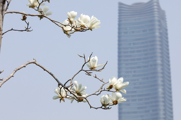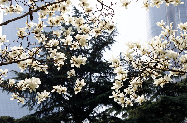 在位于东岸滨江的滨江大道公园,一朵朵白玉兰翘首蓝天,像一只只洁白无瑕的风铃在春风中轻盈摇摆。