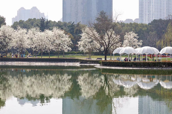在陆家嘴中心绿地,成片的白玉兰洁白如玉,晶莹皎洁,溢满清香。