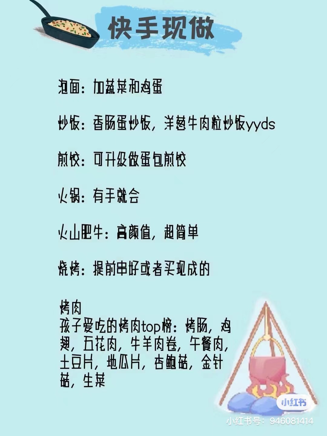 不过,春季露营天气微凉,有些朋友还是想吃口热乎的,尤其,很多人觉得家人朋友一起分工合作,边煮边吃,才是野餐的乐趣所在,就像小时候一样。烧烤、小火锅 、煎饺、海鲜粥、部队锅这些简单易操作且可以快速出餐的现制美食都是可以尝试的。