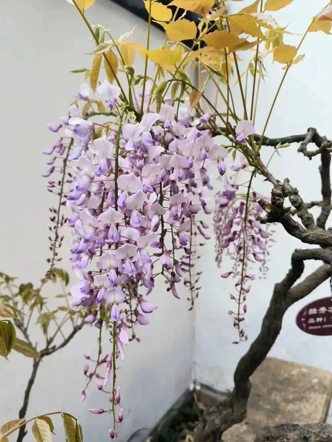 在醉白池盆景园内,一盆约摸50年桩龄的紫藤花开正艳,数串硕大的花穗垂挂枝头,紫中带蓝,煞是美丽。