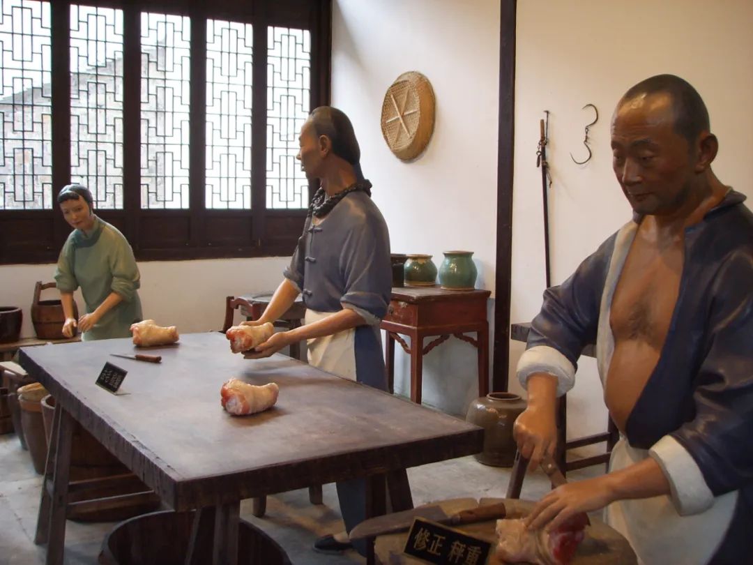 “丁蹄”全名叫枫泾丁义兴蹄膀,始创于咸丰二年(公元1852年),成品汤卤浓厚、肉质细嫩、甜而不腻、肥而不油,深受人们的欢迎。丁蹄非遗文化展示馆一楼展区以蜡像模型再现了枫泾丁蹄古法制作技艺主要八道工序的全过程,二楼展区通过漫画的形式展现了枫泾丁蹄的开创及历史发展过程。