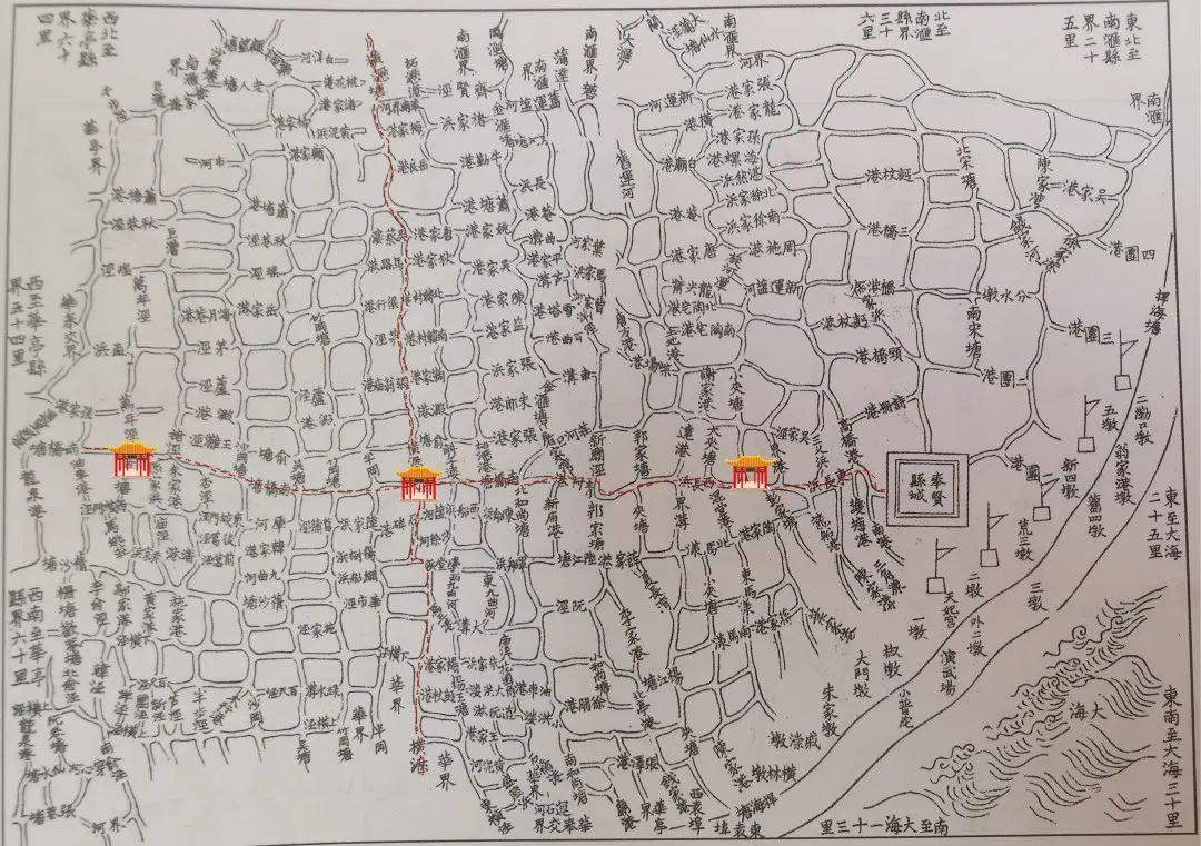 底图为清光绪初年《奉贤县水利总图》,来源于《奉贤县图照志》,红色古镇标记分别为庄行、南桥、青村的大概位置。