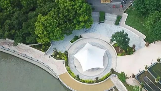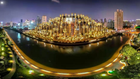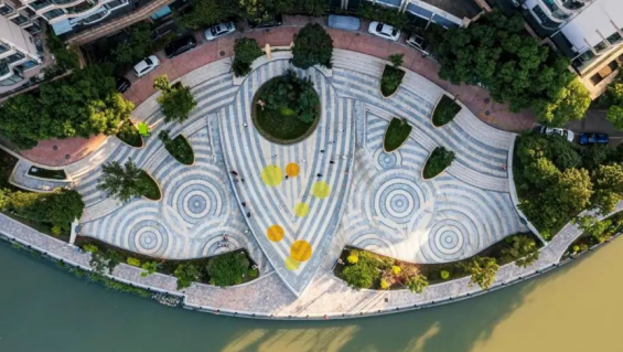 旧时的老码头、圆形广场、大白伞等标志性建筑,承载无数两湾人的旧年回忆。今时的一河两湾以此为轴不断延伸,颇具线性之美的镂空栈道更为广场增添现代美感。