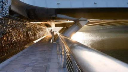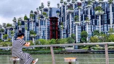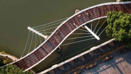 这里金鳞闪动、耀眼如梭,一头对岸是现代感氛围超绝的“天安千树”,一头对岸则是以原始活水生态出名的“梦清园”,穿过栈道、如跃时空。