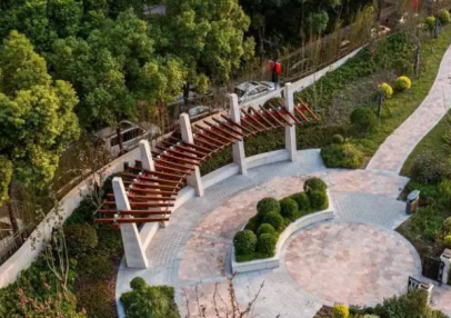 弧形紫藤廊架伫立于此,廊架的木色带给人闲适的观感,让休憩更添美意。当春天降临,更有温柔的紫藤花攀爬于上、垂艳动人,如花间瀑布。