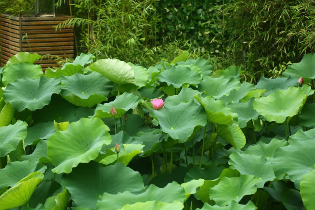 不可无竹居南侧开放的荷花是太空系列中的一种,是荷花中的优良品种,因环绕太空后种子发生变异而性能更加优良,具有花大色艳、花期长、叶繁茂、可净水质等优点。鸳鸯湖中首先绽放的荷花主要是复色系、飞舞状的大型品种荷花,其花瓣白中透粉、婉约淡雅。