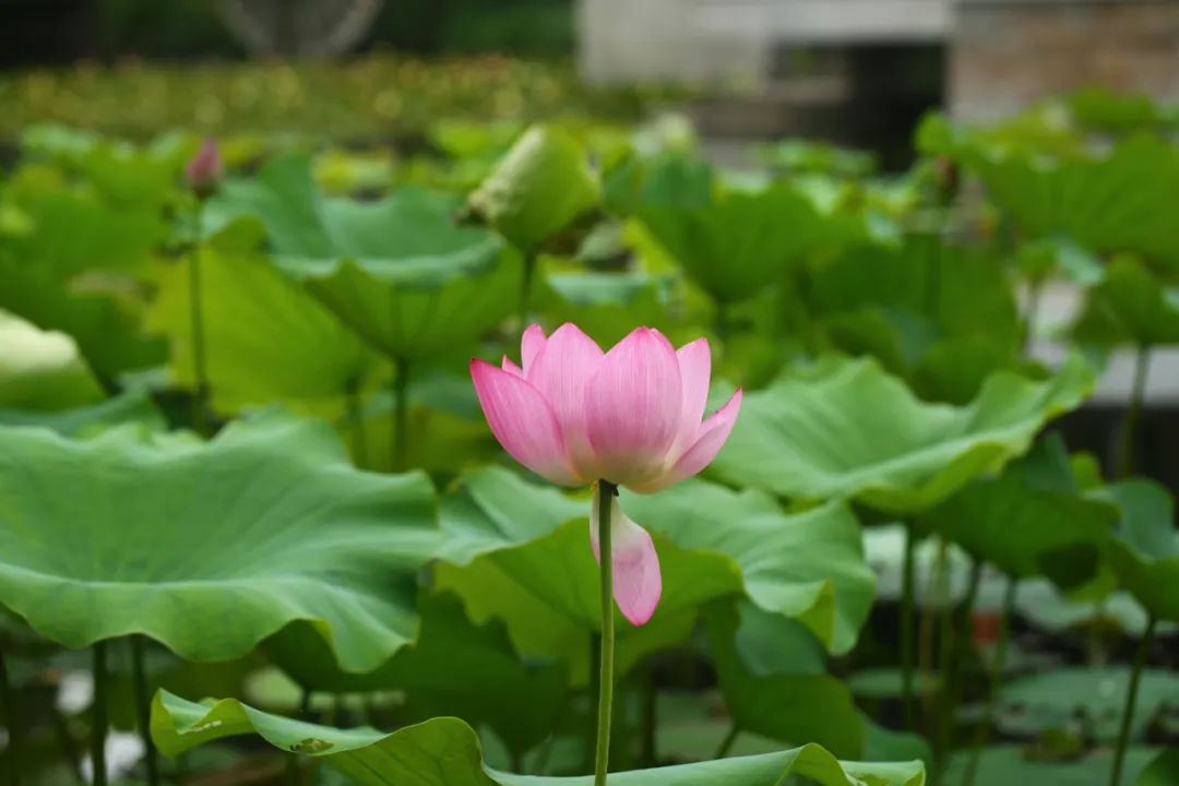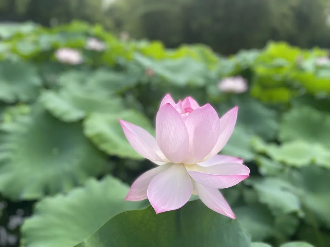 碧绿的荷叶丛中,亭亭玉立的荷花,仿佛是一位位披着粉色薄纱在湖中伫立的仙女,丰姿绰约、娇羞欲语,微风徐徐吹过,水面泛起阵阵微波,荷花也随着涟漪轻轻摇曳起来。