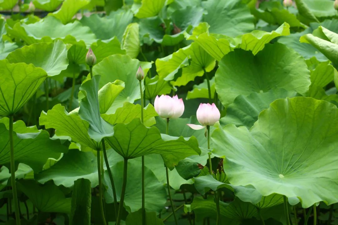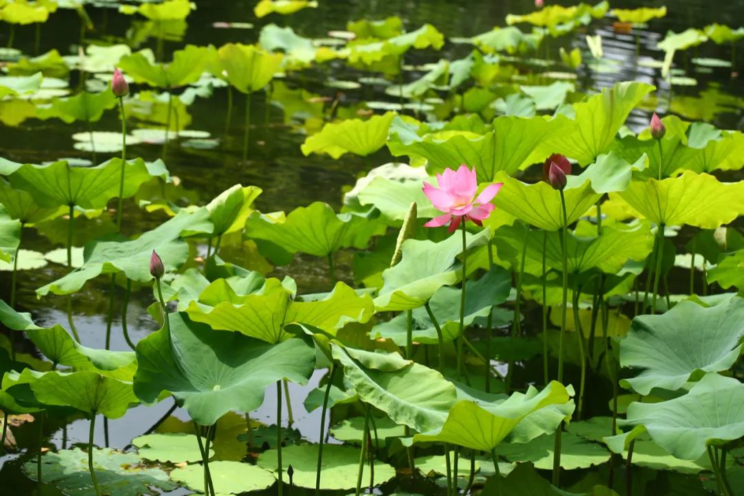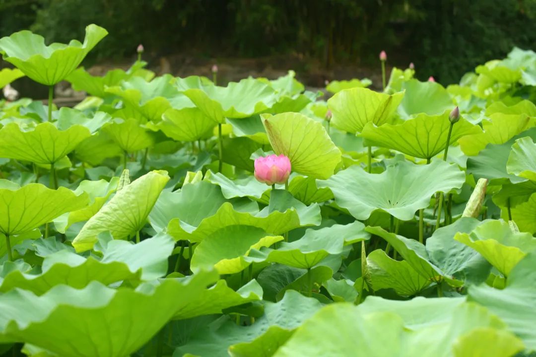 荷叶罗裙一色裁,芙蓉向脸两边开。经历了大雨洗礼过后的荷塘更显得清新雅致,站在荷塘岸边,一眼望去,那片片荷叶,像是撑开的一张张翠绿的油纸伞,有的轻浮于水面,有的挺立在碧波之上,似层层绿浪,如片片翠玉,给第一批绽放的荷花增添几分神秘的气息。