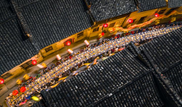 村民舞着龙灯经过安徽省宁国市胡乐镇老街上举办的长桌宴 图片来源:新华社
