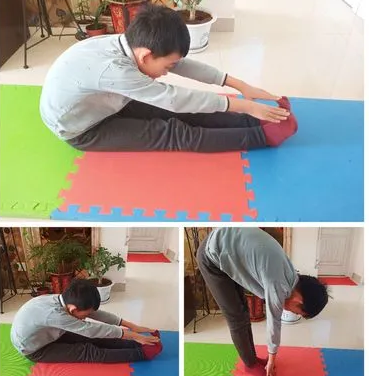 两腿分开伸直坐于地上,身体弯向一侧使面部靠向膝盖,换一侧重复。