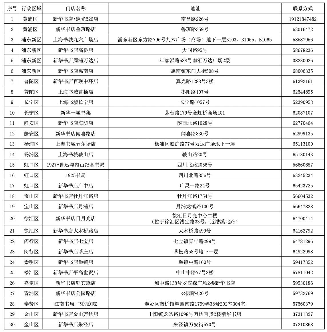 提示:市民游客可通过大麦网、上海书展官网等平台线上扫码购票。为便于老年读者购票,本市30家新华书店门店设线下购票网点(见下图)。根据市公安局要求,各场次门票售完为止,并特别提醒,上海书展现场不售票。