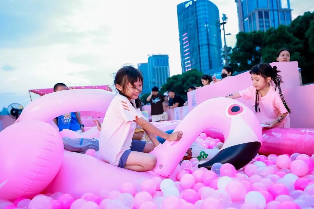 作为此次活动的亮点,数百平的粉色沙滩被“搬”到了现场,不用远离家门,市民就可以漫步在粉色沙滩,感受夏季的无限美好。在沙滩营地区域,精酿啤酒、烘焙小食、遮阳伞、沙滩椅、泡泡泳池成为游客的打卡地。