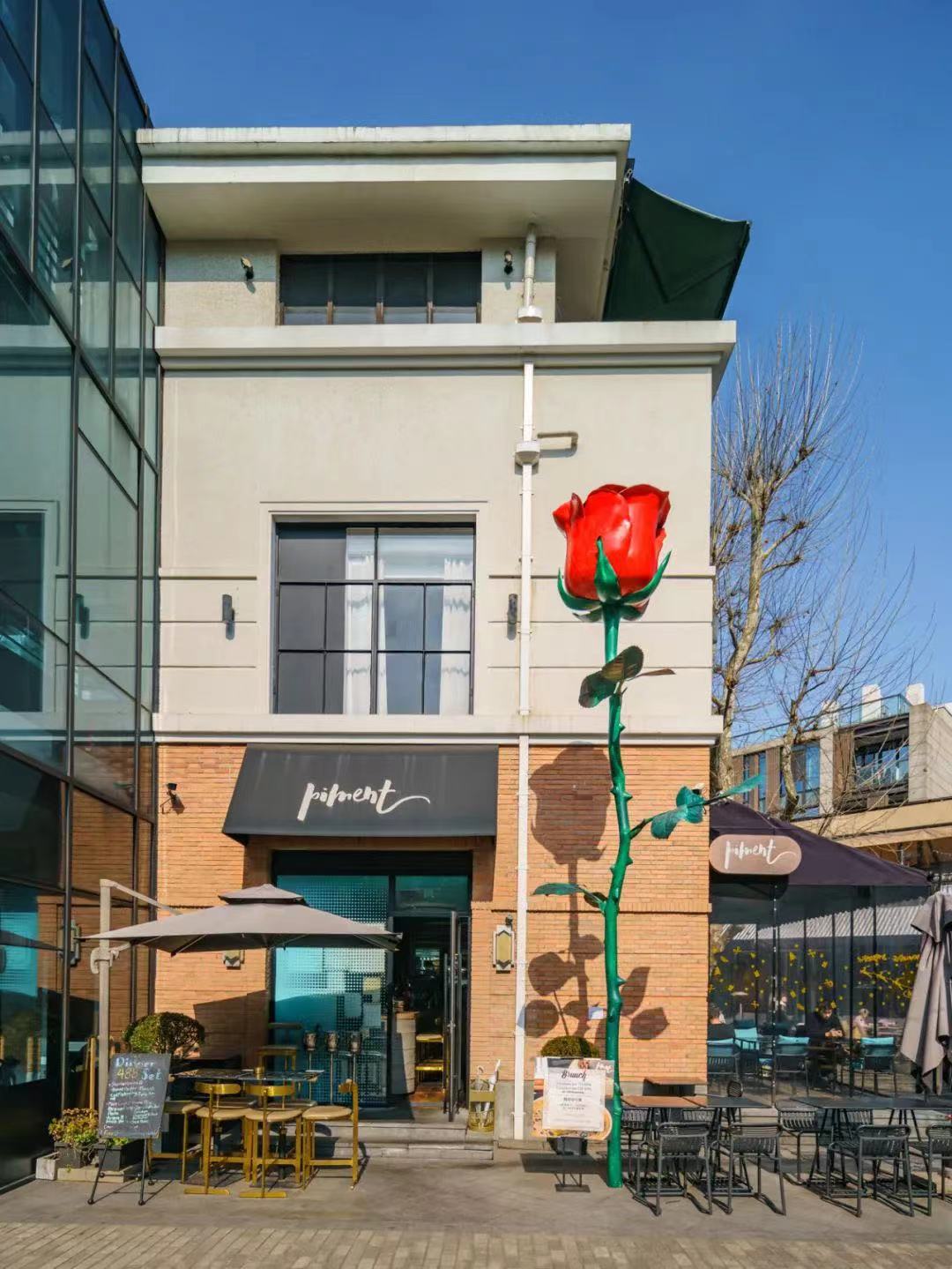 由老式里弄改造而成的永平里,坐拥一众精致商铺和艺术画廊,自带浪漫气息。尤其园内这一支巨型“玫瑰”,绿色的枝干,红色的花朵,也是这里标志性的打卡点,有一种海派交融、雅俗共赏的情调,站在花下合影,同样能收获《小王子》同款场景。