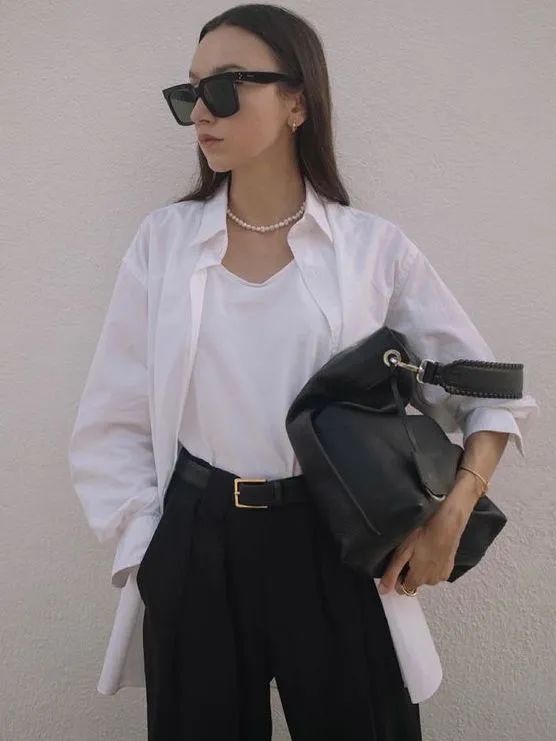 纯白或蓝色衬衫是最不容易过时的款式,但是也要注意不要选过于职业的款式,版型宽松,更好搭配。