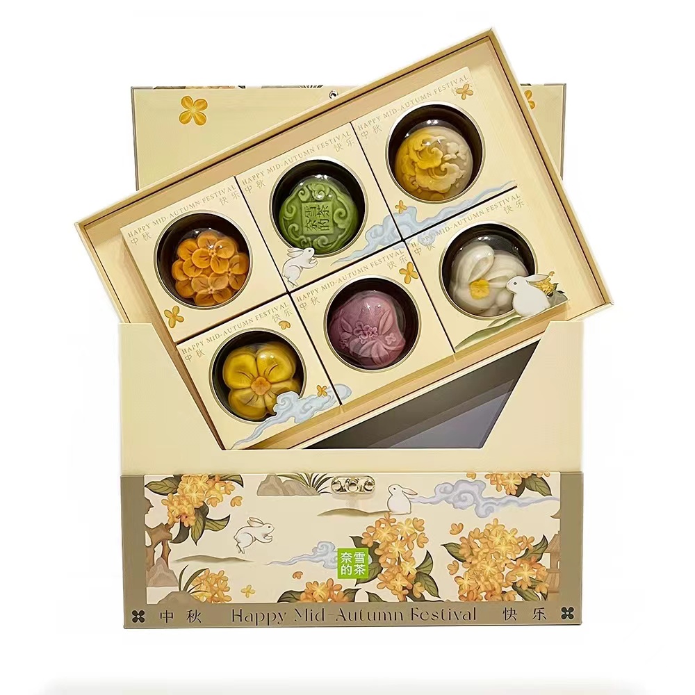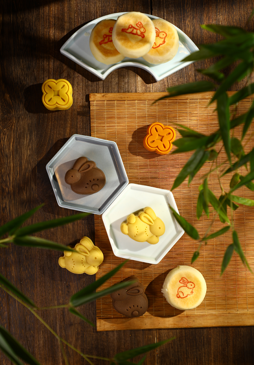 口味上,礼盒中的月饼分为苏式与台式两种,芯馅又有另一番创新。在印有兔子花纹的传统苏式酥皮下,包裹着具有浓浓奶香的乳酪蓝莓和越嚼越香的坚果杂粮口味。台式月饼则更是含“兔”量拉满,黑白两种兔子造型的月饼分别为大红袍丹桂流心与奶黄流心口味,另有两种花朵造型的榛仁巧克力和海盐坚果拿铁口味月饼。