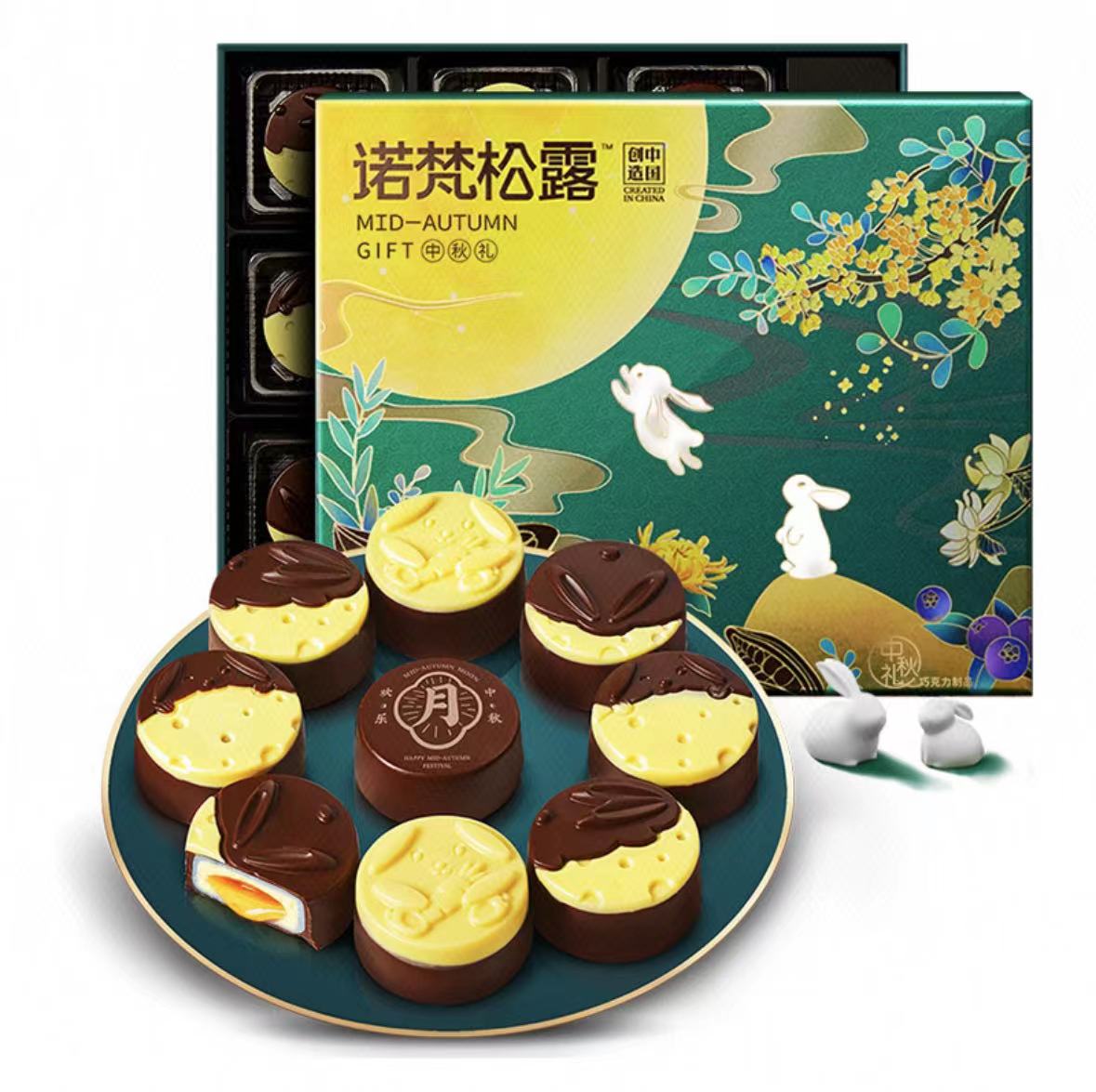 这一款月饼型巧克力创意性地用奶黄色占据的不同面积勾勒出月亮形状,带来不同的视觉体验。