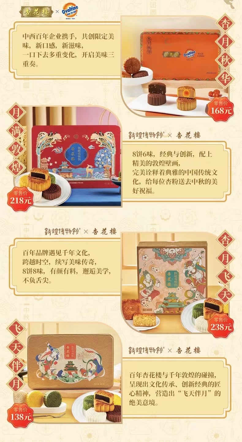 说到中秋,上海人的餐桌上怎么少得了“杏花楼”?今年,杏花楼推出了34款盒装月饼、7款散装月饼。其中有三款是与敦煌博物馆合作推出的,分别是“杏月飞天”“月满敦煌”“飞天伴月”礼盒。
