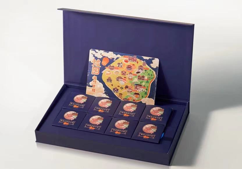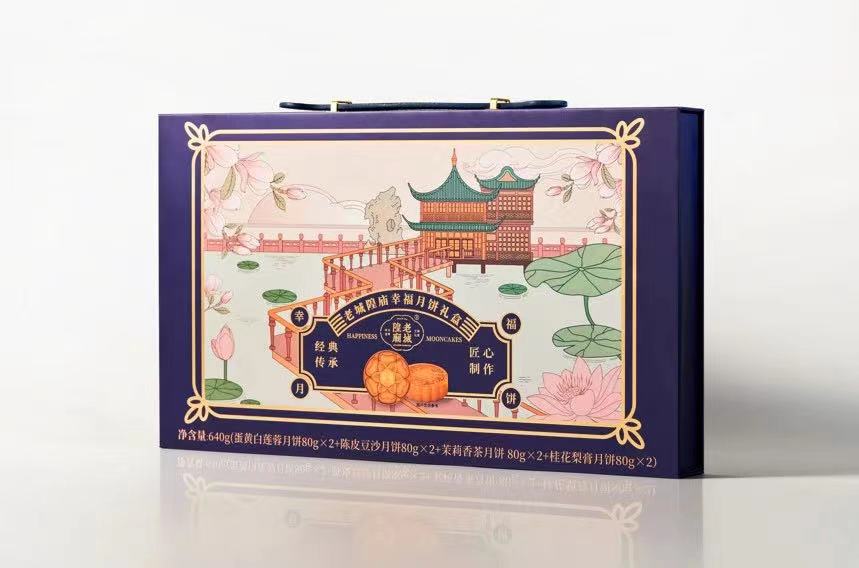 同样在芯馅上下功夫,将传统食物融入月饼的还有老城隍庙,他们推出了桂花梨膏月饼与茉莉香茶月饼。前者中的“梨膏”来源于大家十分熟悉的梨膏糖。除了芯馅以外,此次老城隍庙月饼礼盒的包装同样融入了国潮元素,九曲桥就搬到了月饼礼盒的设计上,食客还可以在盒内找到一张手绘版的“豫园老字号美食逛吃地图”。