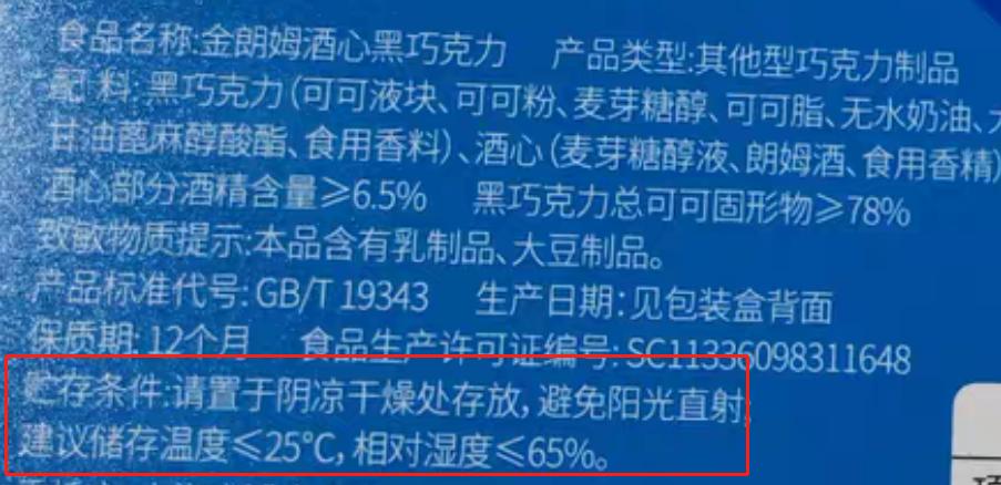 当巧克力在 20℃ 环境中常温存储时,可在一年内保持无起霜状态。所以,买来的巧克力就放在阴凉干燥处保存即可。有些酒心巧克力包装上会标注保存条件,可根据厂家建议保存。
