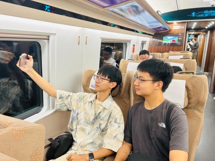 “我在站台的时候就拍了很多照片,这趟亚运列车首发车简直太惊喜了。这次特地选了商务座体验,私密性、舒适性都很好,感觉像把飞机商务舱原封不动地搬进了高铁动车里面,而且列车在运行过程中也很平稳。”小谭一边说着,一边用运动相机记录下车窗外的风景。
