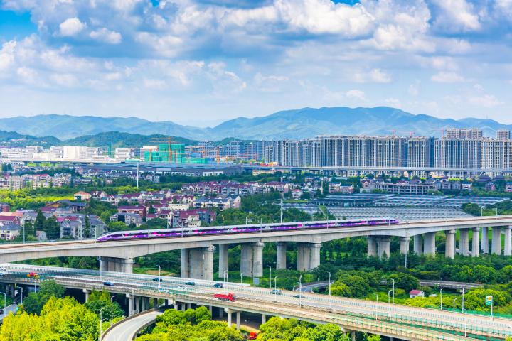 复兴号亚运智能动车组列车,车头似“鹰隼”,身披“虹韵紫”,专为杭州亚运会打造,由浙江交通集团购置,被网友称为“亚运限定版”。该列车为8辆编组,定员578人,设计时速350公里。