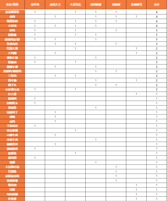 我们选取了附近外卖能点到的较大的6家连锁中式快餐,一项项记录了他们的菜品(荤菜),并制作了表格。