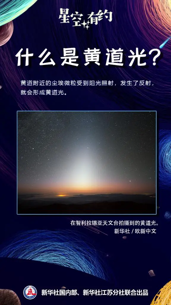 秋分已至,这也意味着观赏黄道光的好时机随之而来。什么是黄道光?天文上将太阳周年视运动的轨迹称为黄道,更通俗地说,就是在地球上看到的太阳一年“走”过的路线。当黄道附近的尘埃微粒受到阳光照射,发生了反射,就会形成黄道光,因此它也有个文艺的名字——太阳系的“尘埃之光”。